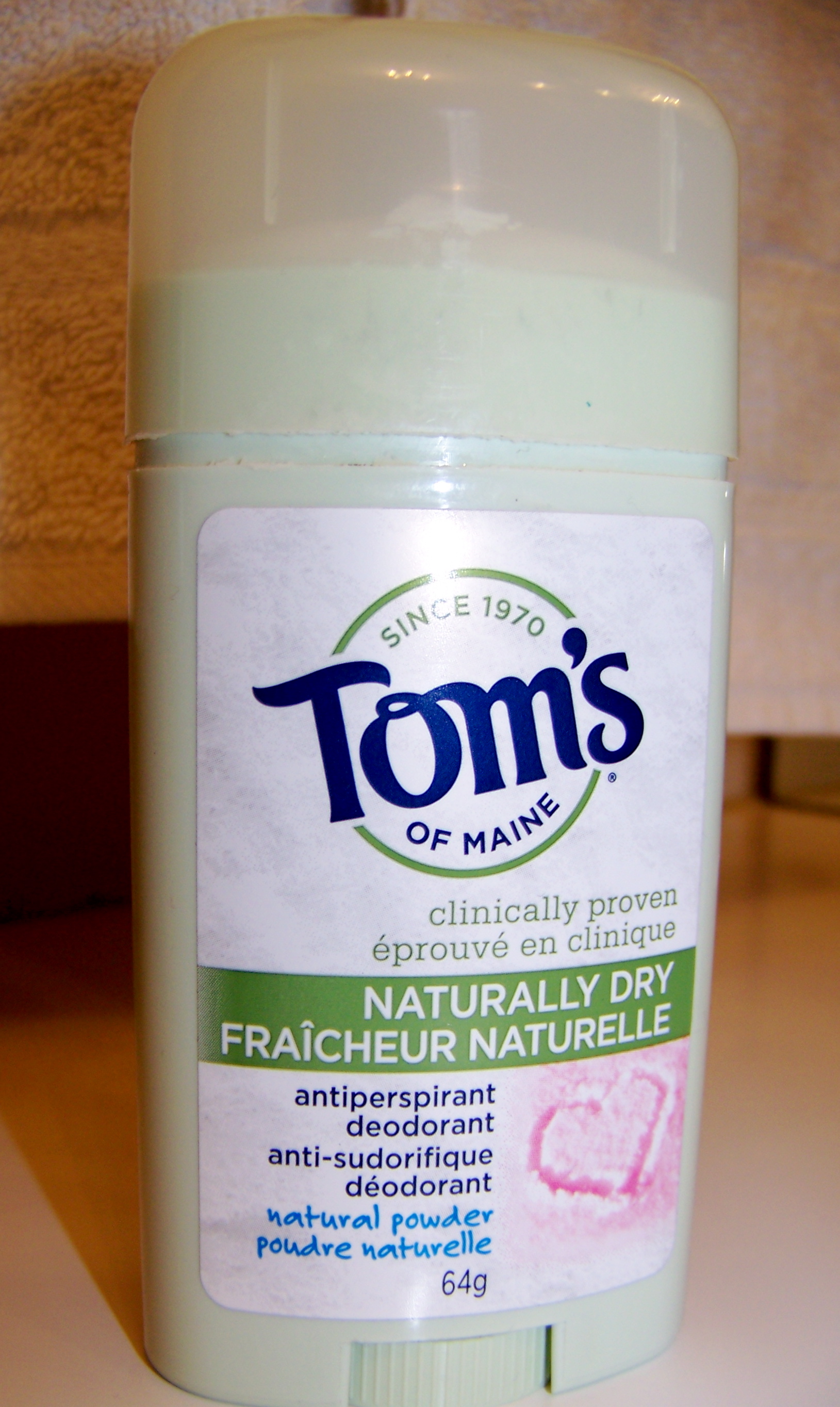 Tom’s of Maine Naturally Dry antiperspirant deodorant The natural powder scent reminded me of the baby powder scent my former faithful had, and I was attracted by the allure of “clinically proven” and “naturally dry.” Here’s a classic case where I should of read the actual ingredient list instead of just the highlighted “petroleum free” and “no artificial preservatives” lines. Then I would have seen it contains aluminum chlorohydrate. PRODUCT NOTES Feels a bit sticky going on. Except during those night sweats (another topic all together), I’m not one to perspire a great deal. That said, no noticeable difference was found using this product versus my former chemical-laden one. BOTTOM LINE Just when I thought I was doing myself a favour by using a natural product, I realize it wasn’t entirely the case and I paid a premium to do so. Next time, I’ll go for their aluminum-free product.