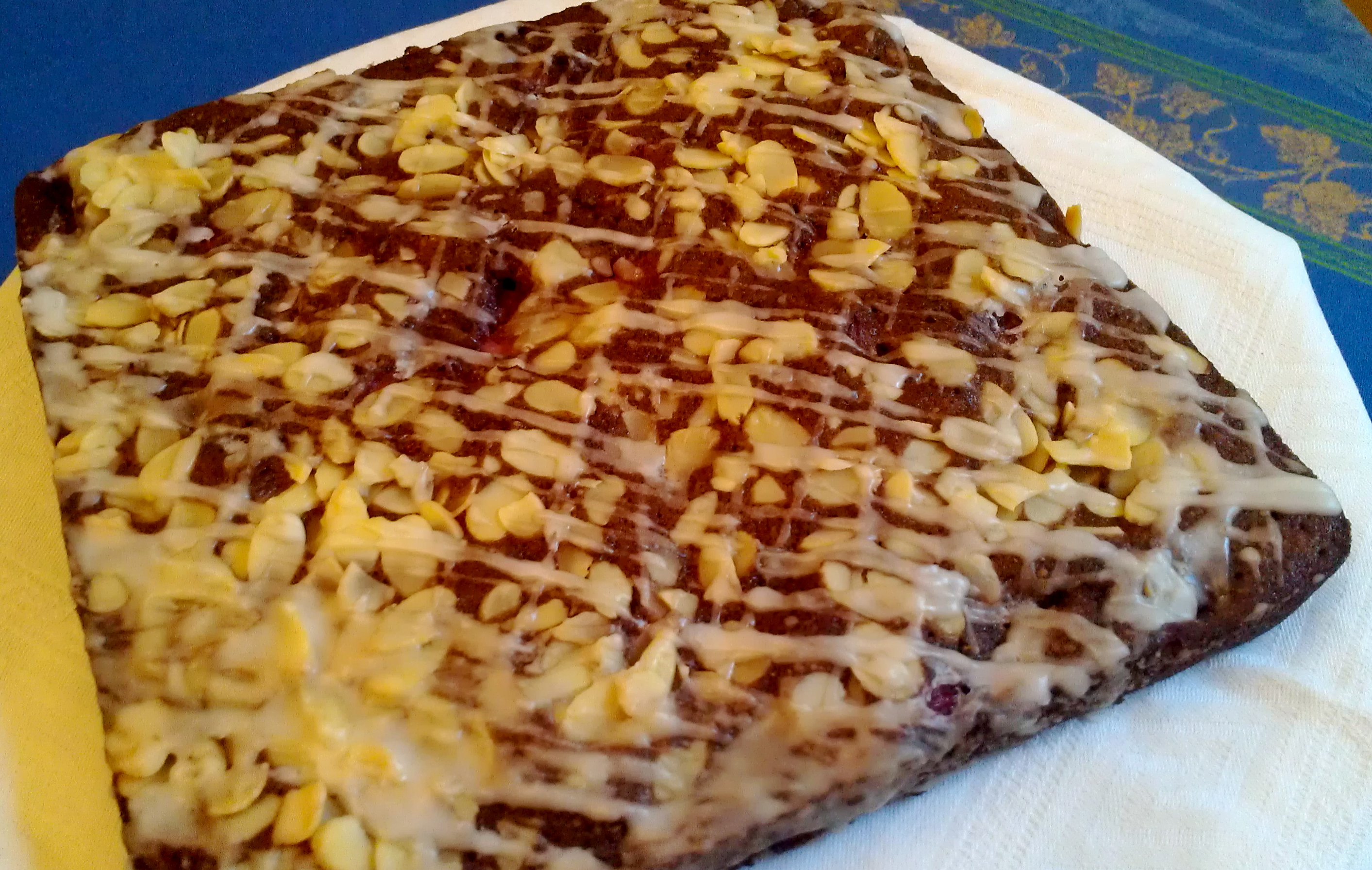 Preheat oven to 350°F. Prepare 8-in square pan with cooking spray. Beat together coconut sugar, oil, egg (or substitute) and vanilla until well mixed. Combine flour and baking soda then add to sugar mixture. Fold in fruit and lemon juice. Pour into prepared pan, smooth and top with sliced almonds. Bake in preheated oven until golden, about 30 to 40 minutes. Cool in pan no more than 10 mins. Drizzle with royal icing if desired. Cut into fingers.